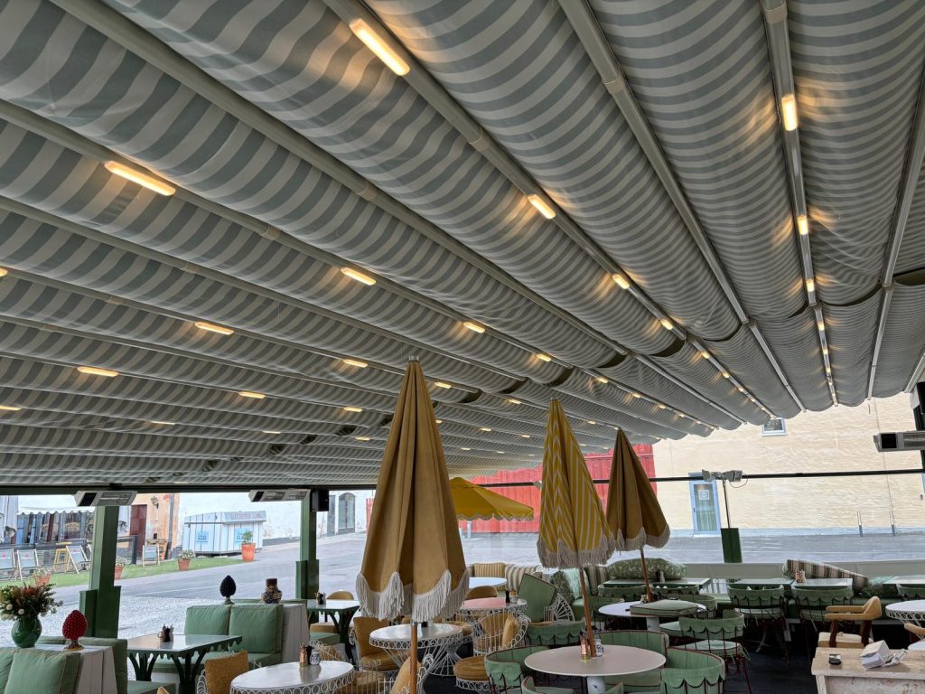 Lamellpanel tak med motordrivet inglasningssystem, skjutparti samt terrassmarkis